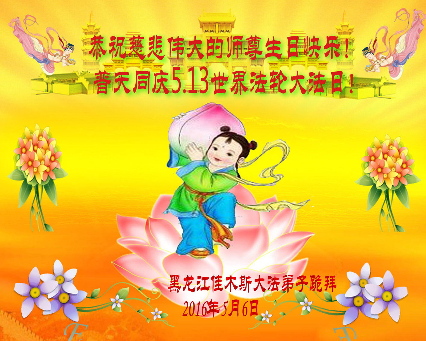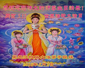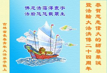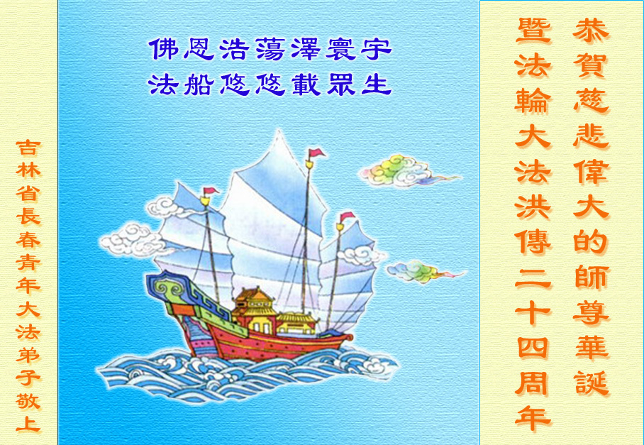 恭贺慈悲伟大的师尊华诞暨法轮大法洪传二十四周年 佛恩浩荡泽寰宇 法船悠悠载众生 吉林省长春青年大法弟子敬上 黑龙江佳木斯市铁路大法弟子恭祝师尊生日快乐!