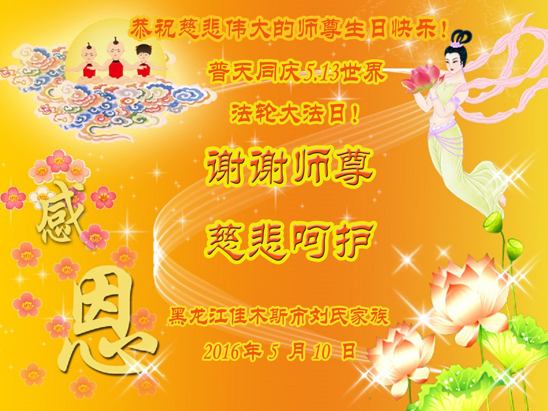 恭祝慈悲伟大的师尊生日快乐! 普天同庆5.13世界法轮大法日! 黑龙江佳木斯市大法弟子刘氏家族敬拜 广东省云浮市全体大法弟子祝贺师尊华诞暨世界法轮大法日!