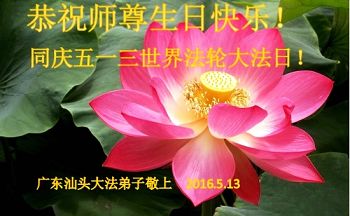 弟子一家祖孙三代都是大法弟子,二十年来一直在大法中深深受益,万分感恩伟大的师父对众生的慈悲救度!虽然我也算是老弟子了,可是修炼这么多年,一直是跌跌撞撞跟头把式的走过来,尤其是在后期的正法修炼中总是没能达到师父要求的“修炼如初”的状态。最近才猛然惊醒!看到自己还有太多的人心和执着没有从根本上彻底改变,深知自己与法的要求和标准差距太远了!我知道这也是慈悲的师父对弟子的呵护点悟,弟子一定要彻底清醒!精進实修、奋起直追,努力跟上正法進程! 在此,我代表全家及随州大法弟子:敬祝师父生日快乐!并恭贺世界法轮大法日! 广东汕头大法弟子恭祝5.13世界法轮大法日!暨师尊华诞!