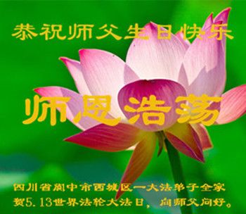四川省成都市郫县一大法弟子全家祝师尊生日快乐!同祝、同贺世界法轮大法日!