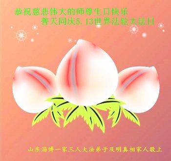山东省淄博市一家三人大法弟子及明真相家人恭祝慈悲伟大的师尊生日快乐!共同庆祝世界法轮大法日!
