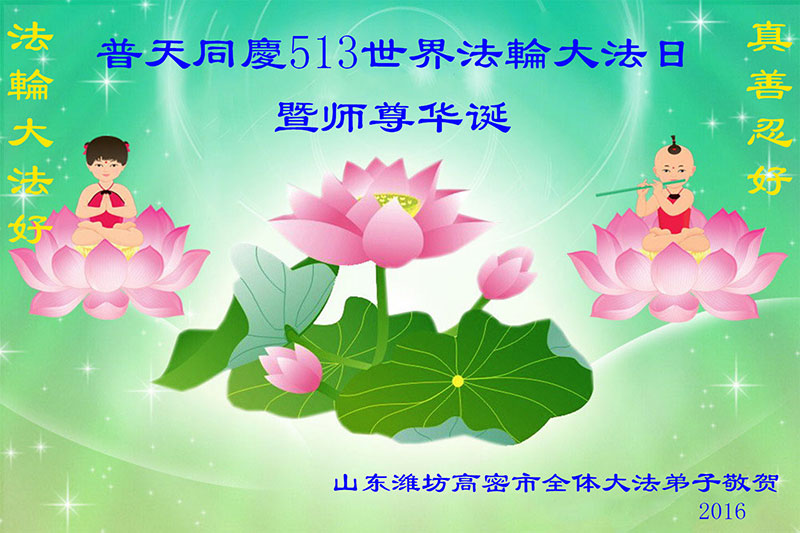 山东潍坊高密市全体大法弟子恭祝师父生日快乐!普天同庆世界法轮大法日!