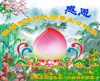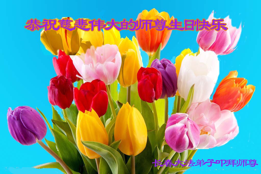 师父您好!师父您辛苦了!在这普天同庆世界法轮大法洪传二十四周年的殊胜日子里,弟子再一次跪拜师尊,祝师尊生日快乐!弟子无以言表您对弟子的慈悲呵护。从九九年到今天在这十七年的中共邪灵造谣、诬陷的日子里,在旧势力强加的迫害中,在黑手烂鬼疯狂的打压中。是您的洪大慈悲寸步不离的呵护着弟子们,弟子一次次的才会有惊无险的走到了今天!我们心中有师父,有宇宙大法在,随师正法的心越来越坚定。才会在挖“私”字的根上下功夫,修去后天形成的人的顽固僵化了的观念,才会走向神。作为正法时期的大法弟子只有多学法,真修实修,一思一念才能在大法中归正,紧跟正法進程,才能走好您给弟子铺好的路!在这佛恩浩荡伟大的历史时刻,弟子只有精進实修,做好三件事,多救人,无条件的配合整体,默默的圆容。唯愿师尊少一点操劳,多一点欣慰。 北京一大法弟子恭祝师尊生日快乐!