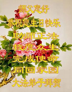今生有幸得大法,无比感恩,无比庆幸!叩谢师尊对我们的再造之恩!作为弟子,唯有用一颗谦卑恭敬的心去同化大法,多救众生,形成一个整体,共同圆容师尊所要的,才能对得起师尊的慈悲苦度。时间真的不多了,我们一定要从根本上改变自己,多救人,圆满跟师尊回家,不负重托,不违誓约! 河北省石家庄市藁城市大法弟子恭祝慈悲伟大的师尊生日快乐!普天同庆世界法轮大法日!