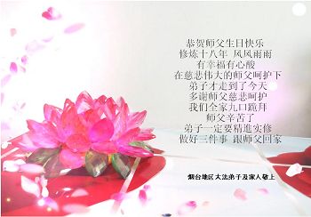 谢恩师 师传大法 共同提高 整体内找 共修心性 三件法宝 心里记牢 真相资料 户户相告 世人都要 明白真相 谢师尊好 河北省石家庄市桥西区某大法弟子和全家人恭祝师父生日快乐!
