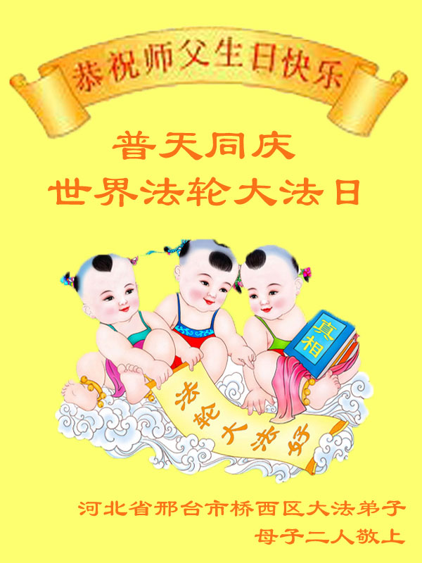 河北省邢台市桥西区大法弟子母子二人恭祝师父生日快乐!普天同庆世界法轮大法日!