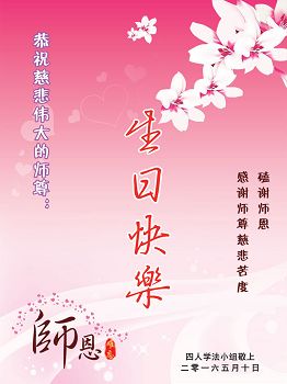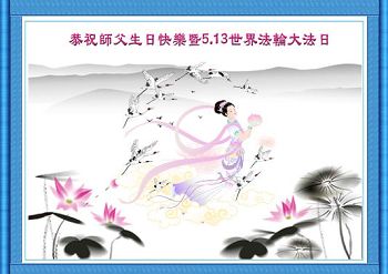 在此代表本地大法弟子向伟大慈悲的师父道一声:师父您辛苦了!弟子让您操心了,谢谢师父的慈悲苦度!我们会用不同的方式去做好自己该做的三件事。法轮大法洪传全球,众生谢师恩。叩谢师父!师父您辛苦了! 山东省青岛一大法弟子了缘恭祝慈悲伟大的师尊生日快乐!普天同庆世界法轮大法日!