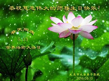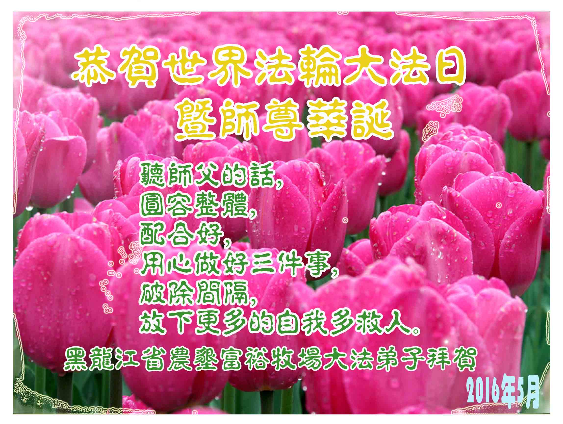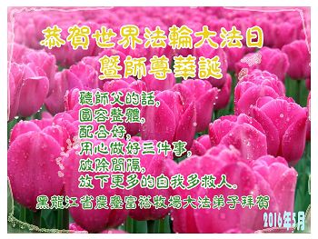 普天同庆5.13世界法轮大法日! 向慈悲伟大的师尊致以生日的问候!恭祝师尊生日快乐!感恩师父慈悲救度和细心呵护! 在正法的最后时刻,我们一定要更加严格要求自己,勇猛精進,修炼如初,助师正法,救度更多众生,让师父多一份欣慰,少一份操劳,完成史前誓愿,跟师父回家! 遂宁市北山学法组弟子拜贺 2016.05.08。 黑龙江省佳木斯市富锦县大法弟子恭祝师尊生日快乐!