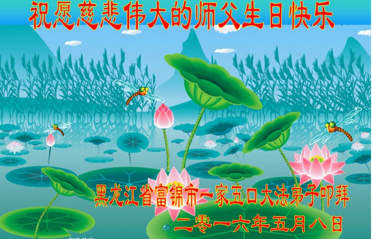 黑龙江省佳木斯市富锦市一家五口大法弟子共同祝愿慈悲伟大的师父生日快乐!