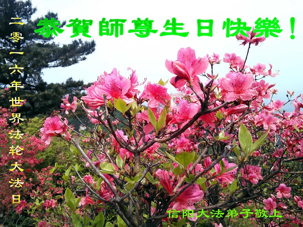 2016年世界法轮大法日来到了,在这喜庆之际,恭贺慈悲伟大的师尊法轮大法李老师:师父好!师父辛苦了!祝师父生日快乐! 我愿唱支歌,感谢神主佛,若非大法传,怎把巨难过。 谢谢师尊 合十 北京石景山区大法弟子 四川教师大法弟子恭祝师尊华诞及大法洪传24周年!感谢师尊的洪大救度之恩!