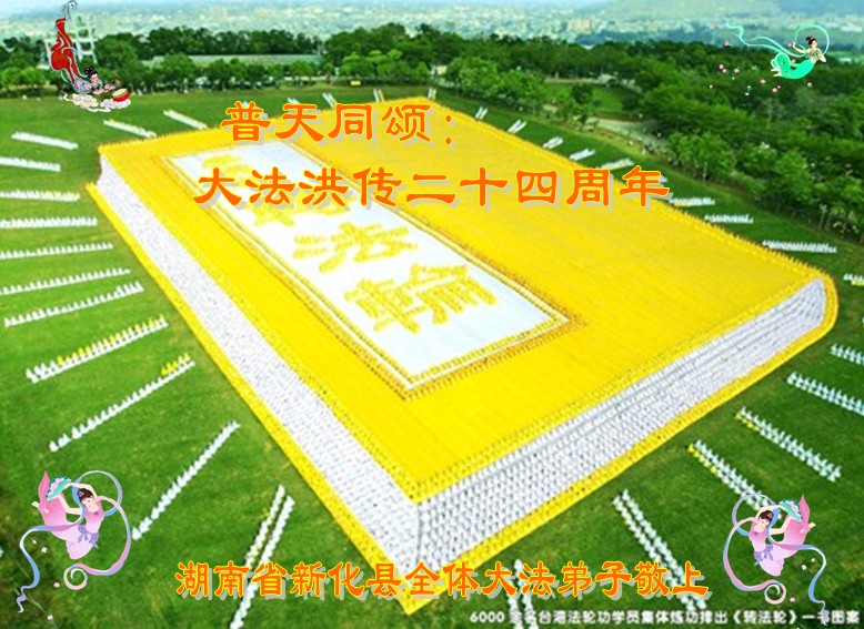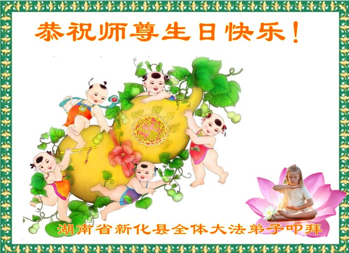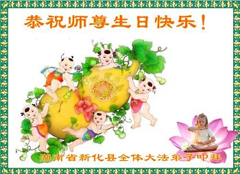 叩谢慈悲伟大的师尊救度之恩!合十! 湖南省娄底市新化县、冷水江市全体大法弟子恭祝慈悲伟大的师父生日暨法轮大法洪传二十四周年!