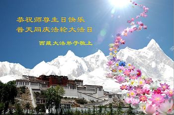 尊敬的师父: 在这同庆世界法轮大法日的时刻,我们衷心恭祝师父生日快乐! 我们小组要更加努力的学好法,在法上提高和升华,不辱大法徒的圣名。 二零一六年世界法轮大法日恭贺。合十。 西藏大法弟子恭祝师尊生日快乐!普天同庆世界法轮大法日!