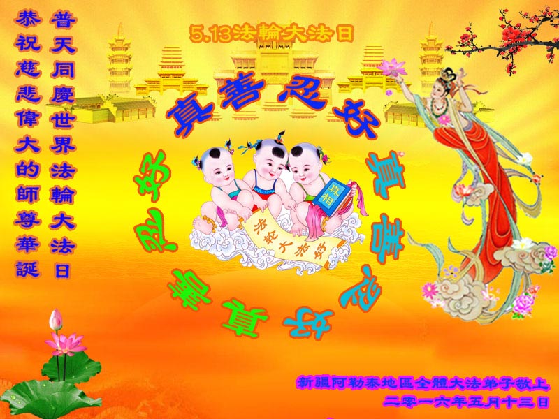 新疆维吾尔自治区全体大法弟子恭祝慈悲伟大的师尊生日快乐!普天同庆5.13世界法轮大法日!恭贺法轮大法洪传二十四周年!