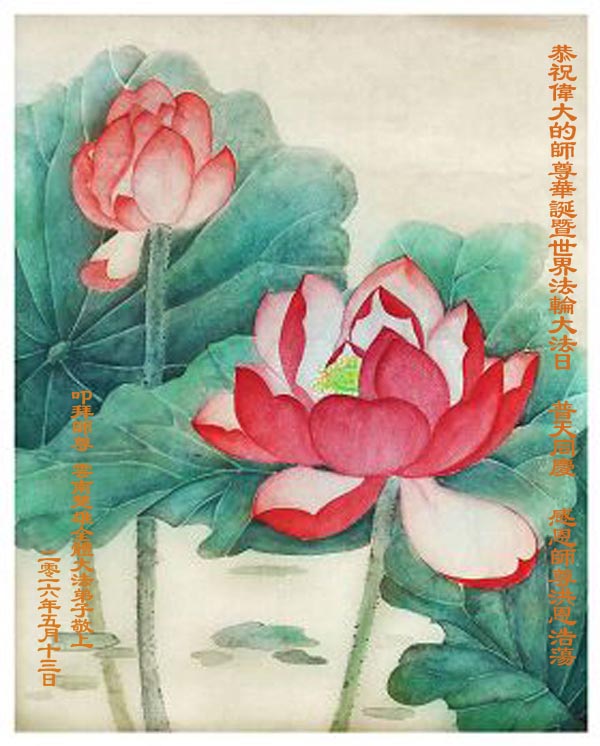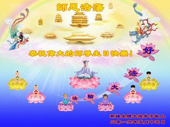 尊敬的师父: 在这同庆世界法轮大法日的时刻,我们衷心恭祝师父生日快乐! 陕西省咸阳市全体大法弟子恭贺 新疆维吾尔自治区乌鲁木齐市全体大法弟子恭祝师尊生日快乐!同庆世界法轮大法日!