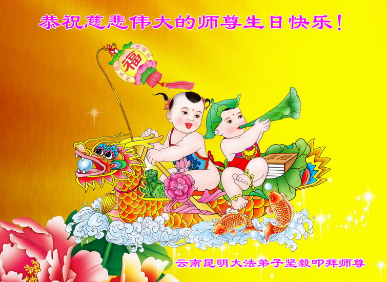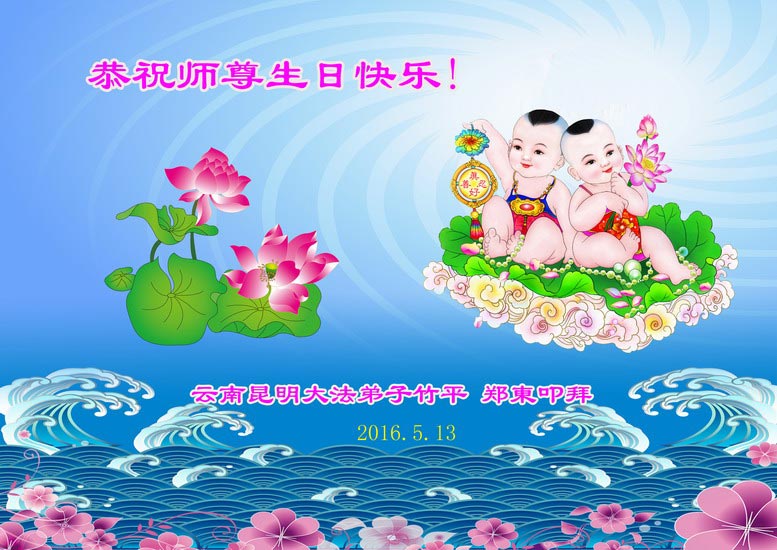 在普天同庆的日子里,我们学好法,按师父的要求做好三件事,心里时刻装着救人的誓约,快救人,多救人。我们小组成员感谢师恩慈悲救度,恭祝师父生日快乐! 诸城一学法小组 云南昆明大法弟子一家5人恭祝世界法轮大法日暨师尊生日快乐!