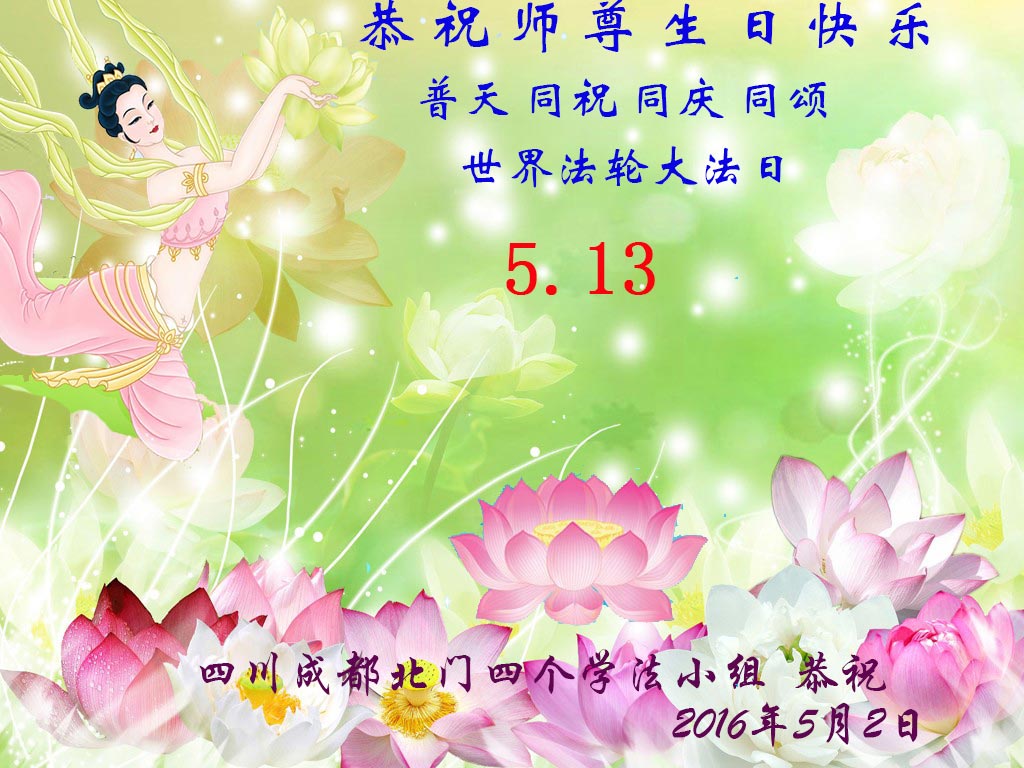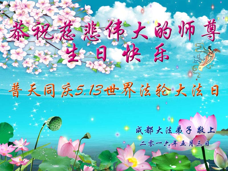 浙江省杭州市西湖区大法弟子叩拜恩师慈悲救度,祝慈悲伟大的师父生日快乐! 四川省成都大法弟子恭祝慈悲伟大的师尊生日快乐!普天同庆世界法轮大法日!