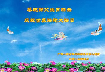 同贺同庆世界法轮大法日! 广东省广州市越秀区大法弟子母子恭祝师父生日快乐!同贺五一三法轮大法日!