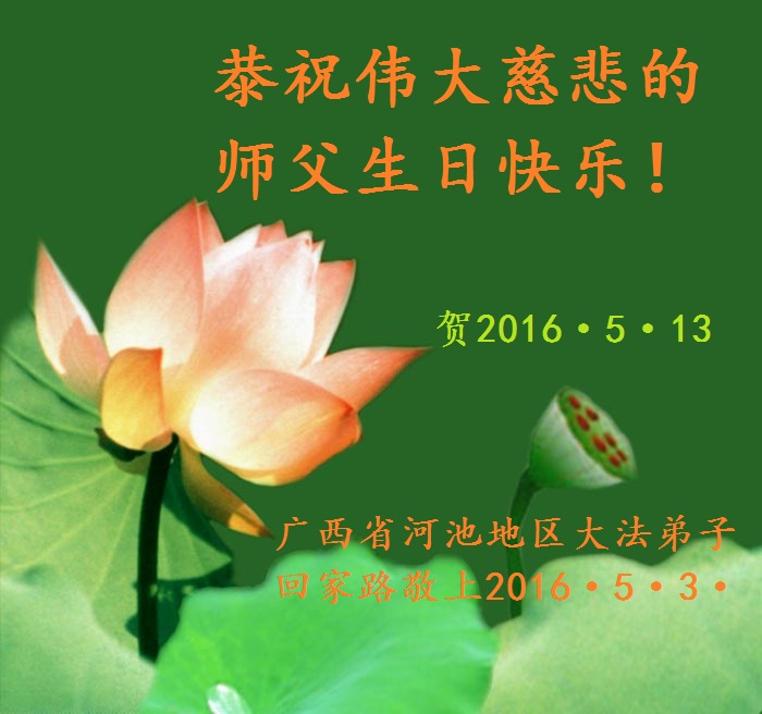二零一六年五月三日 广西壮族自治区玉林市陆川县一位大法弟子恭祝师父生日快乐!同祝法轮大法洪传世界二十四周年!