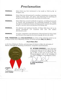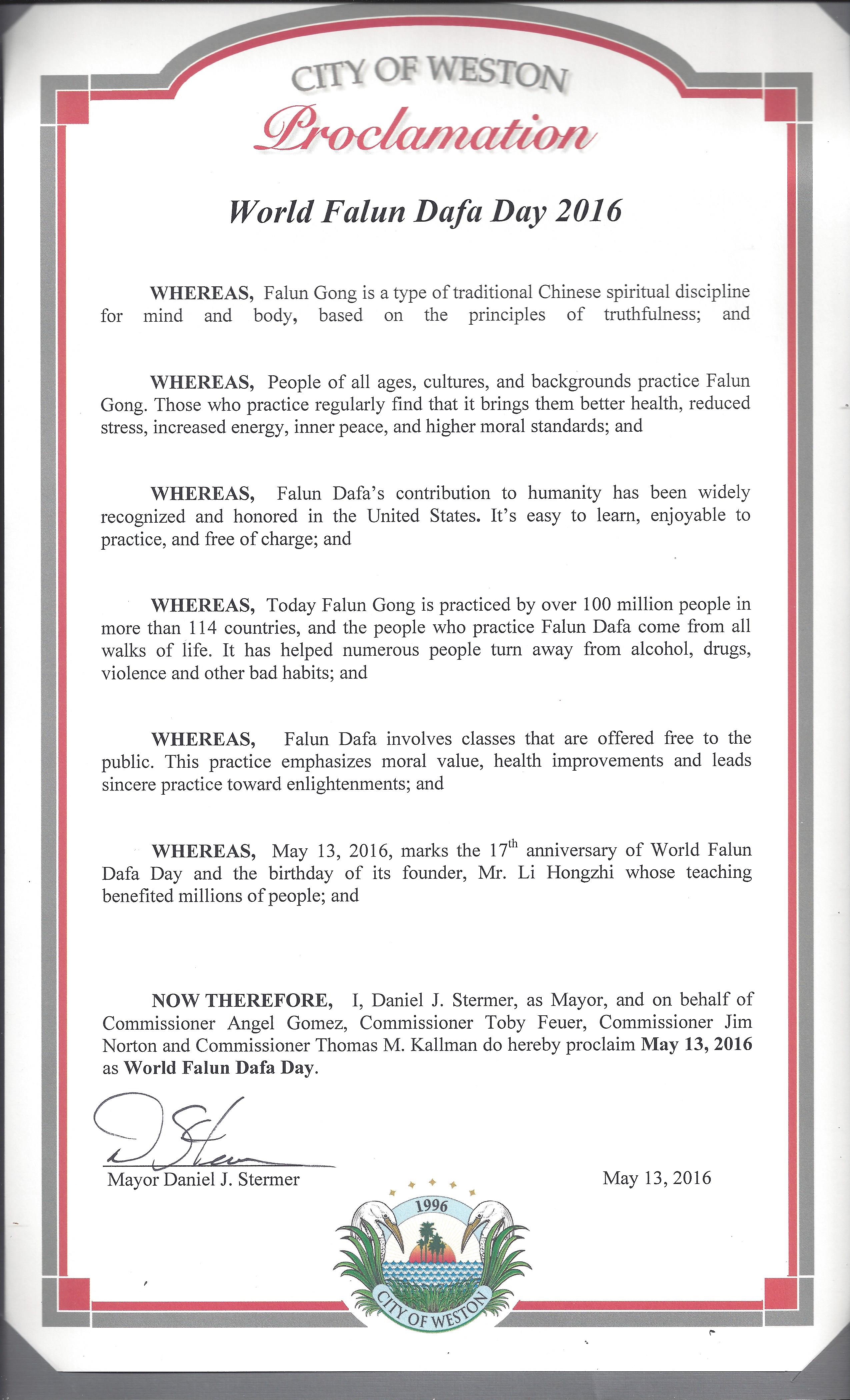 | 【明慧网二零一六年五月十三日】2016年5月13日是第17届世界法轮大法日,也是法轮大法弘传世界24周年。美国佛罗里达州继奥兰多市、劳德代尔堡市、冬季公园市、塞巴斯申市、马盖特市五城市颁发褒奖后,韦斯顿市和梅特兰市也颁发褒奖,颂扬真善忍,宣布法轮大法日。 佛州韦斯顿市市长颁发褒奖,宣布法轮大法日 南佛州布劳沃德郡(Broward)的韦斯顿市(Weston)市长Daniel J. Stermer代表市专员 (Commissioner )Angel Gomez, Toby Feuer, Jim Norton 和 Thomas M. Kallman宣布5月13日为韦斯顿市 “法轮大法日”。 褒奖译文如下: 鉴于,法轮功是中国传统的性命双修功法; 鉴于,各年龄、文化和背景的人都修炼法轮功。经常修炼法轮功的人会增进健康,减少压力,精力充沛,内心平静,和提升道德标准; 鉴于,法轮大法对人类的贡献在美国得到了广泛的认可和赞誉。简单易学,使身心愉悦,并免费教功; 鉴于,现在已有1亿多人、在114个国家修炼法轮大法,修炼法轮大法的人来自各行各业。它帮助很多人远离了酗酒、毒品、暴力以及其它不良生活习惯; 鉴于,法轮大法向公众免费开放。这种修炼强调道德价值、改善健康、并能使真正修炼的人达到开功开悟; 鉴于,2016年5月13日是世界法轮大法日第17周年,也是法轮大法创始人李洪志先生的生日,他的教导使上亿人从中获益; 因此,现在我,Daniel J. Stermer作为市长,并代表市专员 (Commissioner )Angel Gomez, Toby Feuer, Jim Norton 和 Thomas M. Kallman宣布5月13日为韦斯顿市 (Weston)“法轮大法日”。 佛州梅特兰市市长颁发褒奖,宣布法轮大法日 5月9日,中佛州梅特兰市(City of Maitland)的市长DALE McDONALD宣布2016年5月13日为梅特兰市法轮大法日,并鼓励所有市民遵循李洪志大师所教导的真,善,忍原则。 褒奖译文如下: 鉴于,法轮大法1992年由李洪志先生首次向世界弘传; 鉴于,法轮大法对身心健康已显示出奇效,并使得来自各界的修炼者从中受益; 鉴于,法轮大法已获得全世界的认可,其中包括成千上万的奖项和褒奖,因为他通过中国传统的自我提高促进社会和睦,并引导修炼者得到精神,道德和身体的福祉; 鉴于,法轮大法对人身心上的好处使得1亿人修炼,并在114个国家广泛传播; 鉴于,法轮大法修炼者展现出的大善、大忍之心已经影响到了世界各地人们的生活; 因此,现在,我,DALE McDONALD 作为梅特兰市(City of Maitland)的市长,特此宣布2016年5月13日为梅特兰市: 法轮大法日,并鼓励所有市民遵循李洪志大师所教导的真,善,忍原则。