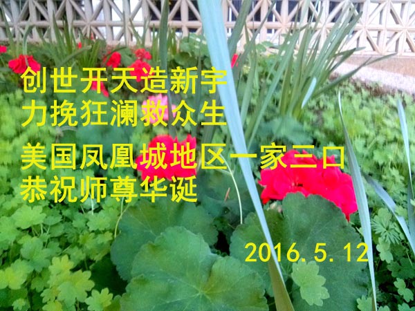 海外清华大学校友大法弟子祝师父生日快乐!“师父,您辛苦了!!” 师尊的慈悲苦度之恩,我们难以回报,唯有更加精進,再精進,助师正法救度更多众生,让您多一丝欣慰,少一份操心,完成我们的史前大愿。 海外清华大学校友大法弟子敬上 二零一六年五月十三日 湖北省襄樊市枣阳市在新泽西的大法小弟子携家人恭祝师尊生日快乐!庆祝世界法轮大法日举办十七周年!