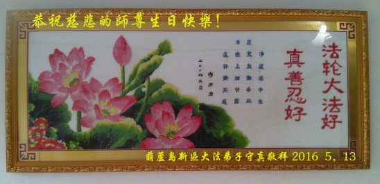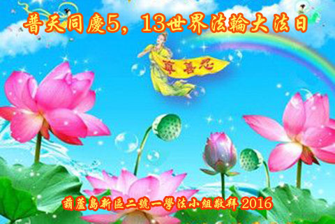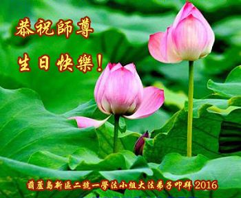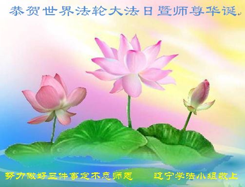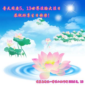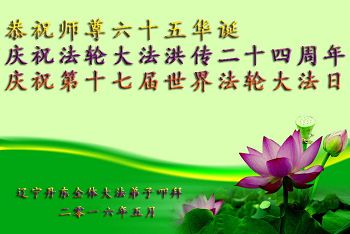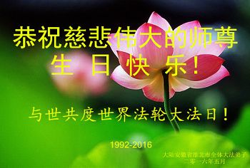 在这十几年的风风雨雨中,我们有过彷徨、有过苦恼、有过失落,但是凭着对师父对大法的坚信,我们走过来了,我们一定沿着师父指引的正法之路走到底。 今天是世界法轮大法日,师父传法二十四周年,在这个普天同庆的日子里,我们衷心祝愿慈悲伟大的师尊生日快乐! 北京科技大学全体大法弟子敬上 二零一六年5月13日 辽宁大法弟子恭贺世界法轮大法日!