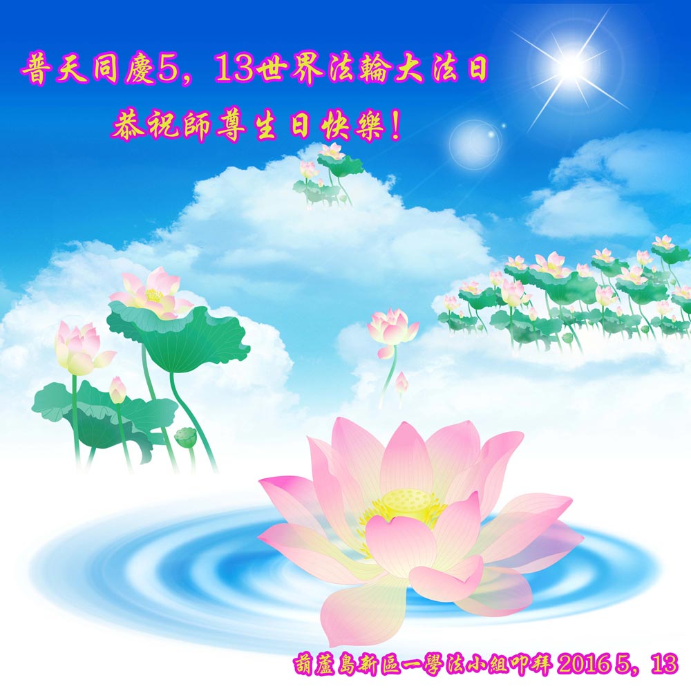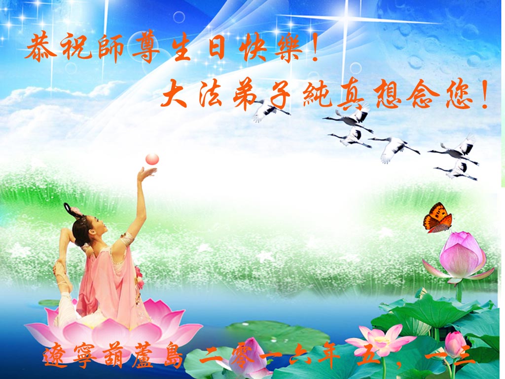 葫芦岛市新区二号学法小组大法弟子恭祝慈悲伟大的师尊生日快乐!同庆5.13世界法轮大法日! 师父您辛苦了!弟子想念您!盼师归!感恩师尊慈悲的苦度,我们用心学好法,向内找,修好自己。圆容整体,配合做好师父要求的三件事。勇猛精進,修炼如初。助师正法,救度众生。平稳的走好师父安排的修炼的路,圆满随师回到那圣洁的家园。 全体大法弟子叩拜师尊!谢谢师父! 二零一六年五月一三日 辽宁省葫芦岛新区二号小区大法弟子恭祝师尊生日快乐!