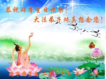 我是大陆大法弟子,在5.13这个特别的日子里,我和师兄弟姐妹们恭祝师尊生日快乐!我们没有华丽的辞藻和精美的贺卡,只记得史前的誓约,只有心底的思念。不敢忘记师尊的教诲,时刻内修自身,助师正法,待到天清体透时,洪愿完成时,再与师尊见。 师父您辛苦了!想念您的弟子们向您叩首了! 黑龙江大庆大法弟子恭祝师尊生日快乐!