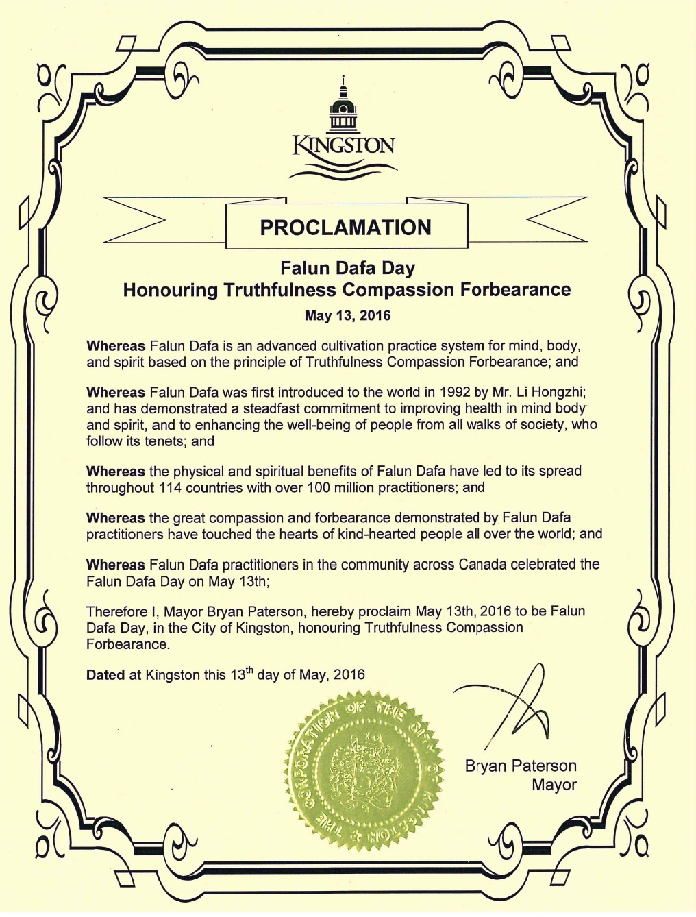 褒奖译文如下: 褒奖二零一六年五月十三日法轮大法日暨颂扬真善忍的原则鉴于,法轮大法是以真善忍为原则的高层次的修炼体系,有益于人们的思想,身体和精神健康; 鉴于,法轮大法于一九九二年由李洪志先生弘传于世,来自社会各个阶层的修炼人遵循法轮大法原则,见证了他增进身心健康的确凿功效; 鉴于,法轮大法已弘传世界一百多个国家,多于一亿的修炼者在大法中修炼; 鉴于,法轮大法修炼者表现出的大善大忍感动了善良的世人; 鉴于,全加拿大法轮大法修炼者将在五月十三日同庆同祝法轮大法日; 鉴此,我,帕特森市长,褒奖二零一六年五月十三日为法轮大法日,暨表彰“真善忍”的原则。 二零一六年五月十一日于安大略省金斯敦市 布莱恩•帕特森(Bryan Paterson) 金斯顿市长