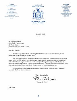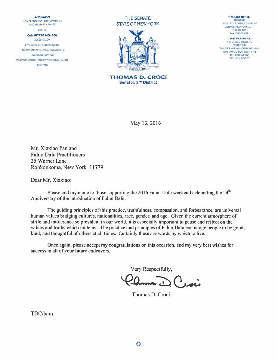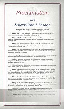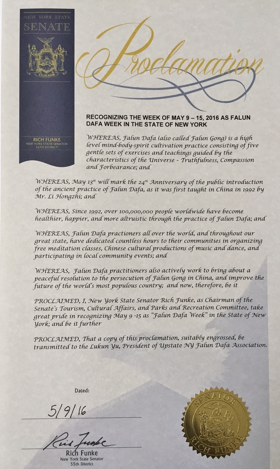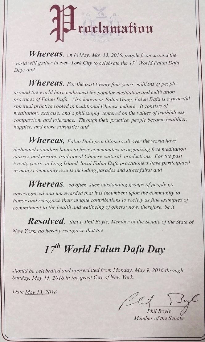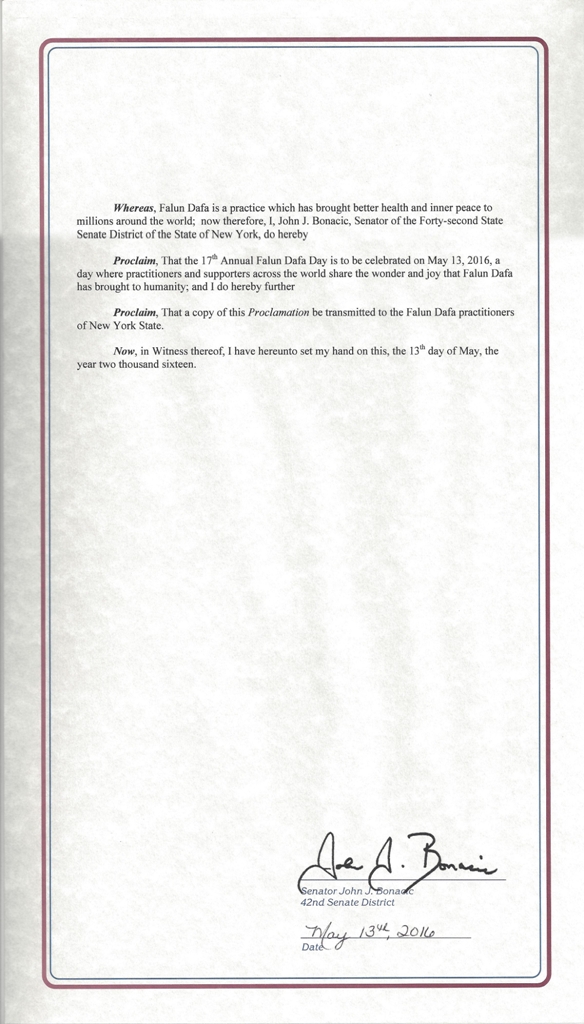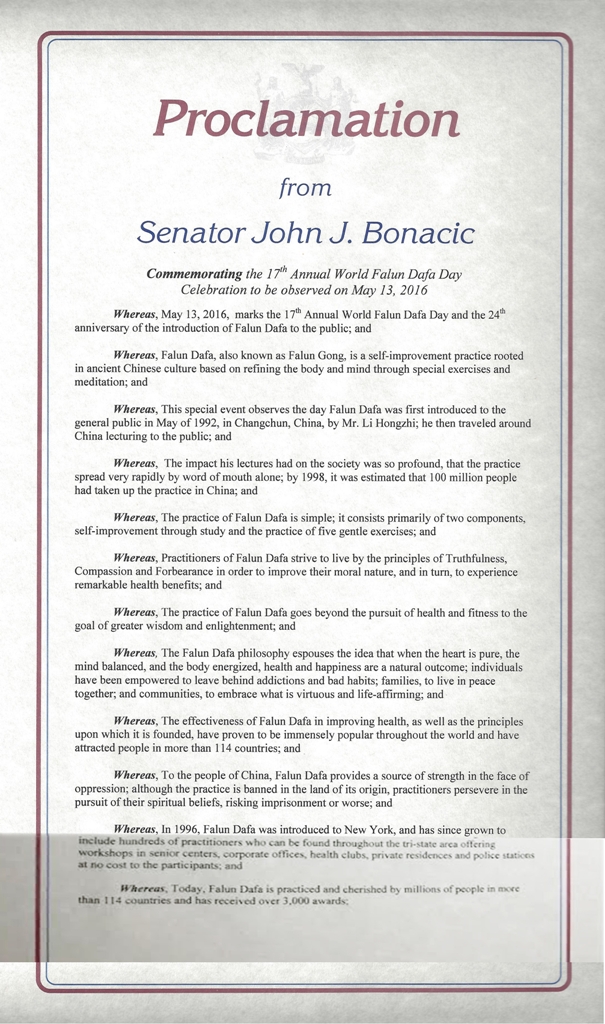 | 【明慧网二零一六年五月二十日】(明慧记者采菊纽约报道)二零一六年五月庆祝第十七届世界法轮大法日期间,纽约州各级官员共有一百零三位发来褒奖和贺信,祝贺法轮大法日, 赞扬法轮大法“真、善、忍”是普世价值,修炼法轮大法帮助上亿人获得身心健康。 由六十三位参议员组成的纽约州参议院不仅全体通过了第七选区参议员Jack Martins发起的4090号决议案,祝贺“二零一六年五月十三日第十七届世界法轮大法日”,来自第三、第四、第四十二和第五十五选区的参议员又发来褒奖和贺信,赞扬法轮大法的美好。 第三选区参议员Thomas D. Croci颁发的褒奖 第三选区参议员Thomas D. Croci 和他颁发的褒奖第三选区参议员Thomas D. Croci 在贺信中盛赞“法轮大法的真善忍是普世价值,能够超越所有文化、民族、种族、性别和年龄的差异。目前我们的世界充满了冲突和不宽容,我们能静下来思考这个能把世界联合在一起的普世价值显得特别的重要。法轮大法的修炼和原则,鼓励人们做好人,善良,在任何时候都以他人为先。很显然这些是人类应该遵循的生活准则。” 第四选区参议员Philip M.Boyle颁发的褒奖 第四选区参议员Philip M. Boyle和他颁发的褒奖第四选区参议员Philip M. Boyle在褒奖中称赞“在过去的二十四年中,世界上上亿的人们在修炼法轮大法中获益。法轮大法是根植于中国传统文化的精神修炼,由动功和静功组成,以真善忍为准则。通过修炼,人们变的更健康、快乐、帮助他人。” 参议员Philip M.Boyle在褒奖中还称赞“全世界的法轮大法修炼者都致力于在各自的社区内提供免费的教功班和介绍中国传统文化。过去的二十年中,住在长岛的法轮大法修炼者参加了包括游行和集市的很多社区活动。” 第四十二选区参议员John J. Bonacic颁发的褒奖  第四十二选区参议员John J. Bonacic | 第四十二选区参议员John J. Bonacic颁发的褒奖第四十二选区参议员John J. Bonacic 在褒奖中赞扬“法轮大法简单易学,遵循真、善、忍的原则,使人们身心获得巨大提升,为全世界上亿人带来健康与内心的平静。” 参议员John J. Bonacic 还在褒奖中感叹“法轮大法是在中国遭受迫害的人群的力量源泉,尽管在他的起源地遭受迫害,法轮大法修炼者冒着被关甚至更残酷的危险,持之以恒地追求精神信仰。” 第五十五选区参议员Rich Funke颁发的褒奖 第五十五选区参议员Rich Funke和他颁发的褒奖第五十五选区参议员Rich Funke在褒奖中指定“二零一六年五月九号至十五号是纽约州的法轮大法周。” 参议员Rich Funke在褒奖中赞扬“法轮大法也称做法轮功,是上乘的心灵-身体-精神为一体的修炼大法,有五套功法,遵循宇宙最高特性‘真、善、忍’为指导”, 他并在褒奖中称赞“全世界的法轮大法修炼者都致力于在各自的社区内提供免费的教功班和介绍中国传统文化,积极参加社区里的活动。同时,在中国的 法轮大法修炼者一直很努力地以平和的方式对待在中国发生的对法轮功的迫害,正在帮助提升这个世界上人口最多的国家的未来。”