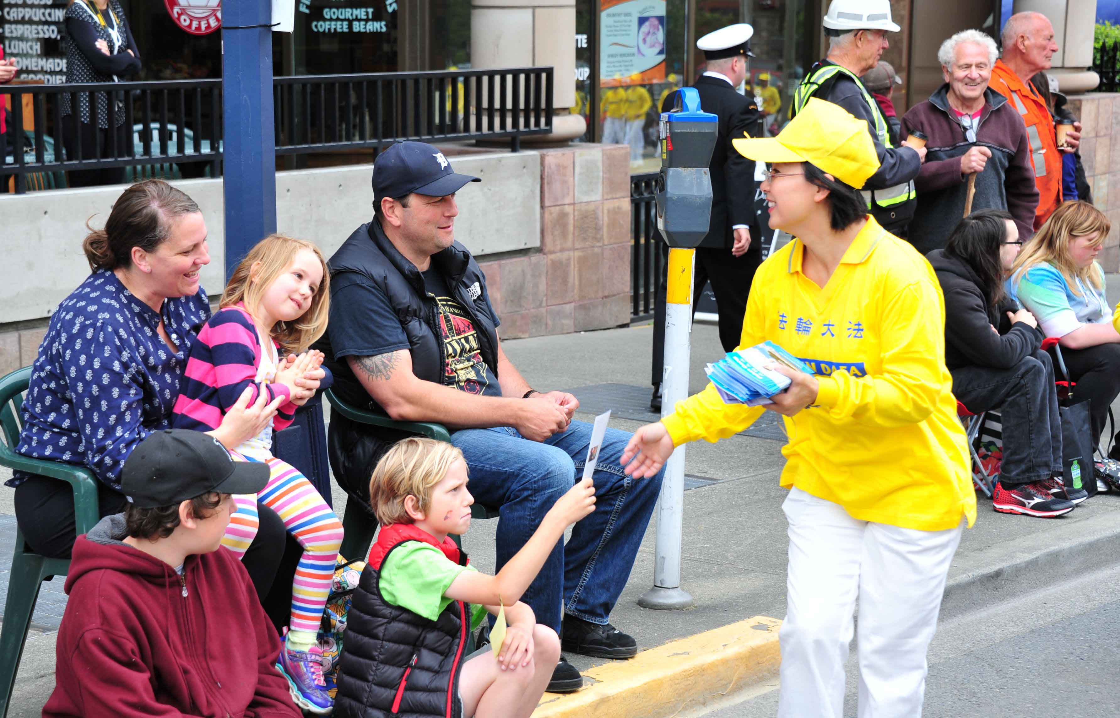 | 【明慧网二零一六年五月二十六日】(明慧记者张然综合报道)2016年5月23日是加拿大卑诗省长周末,温哥华法轮功学员参加了卑诗省首府维多利亚市的维多利亚日游行,中国游客说感受到法轮功学员“都很愉悦和正面向上”。 大陆游客大开眼界 来自大陆的游客郭先生说:“维多利亚游行是我来到海外第二次观看游行,在这个场合里能感觉到海外自由和喜庆的气氛。我看到法轮大法团体并不是像中共宣传的那样,他们就是锻炼身体和加强修养。”他表示,到海外旅行大开眼界。 来自大陆的留学生王先生在维多利亚留学半年了,他看到法轮大法队伍整齐的阵容和精彩的表演时,说:“在国内时,所了解到的信息都是来自国内(中共电视、报纸上的)的宣传,当时并不知道真假,以至于到海外一听说法轮功还有抵触情绪。可是,今天亲眼看到法轮大法的军乐队、‘真善忍’花车、腰鼓队以及炼功等的演示,感觉到法轮功学员的精神面貌非常好,大家都很愉悦和正面向上。所以,我觉得身在国外不能把国内的偏见带到海外来。”他还表示要上网多了解一下法轮功的讯息。  图1-7:法轮功学员参加加拿大卑诗省首府维多利亚市的维多利亚日游行,受到观众热烈欢迎 |