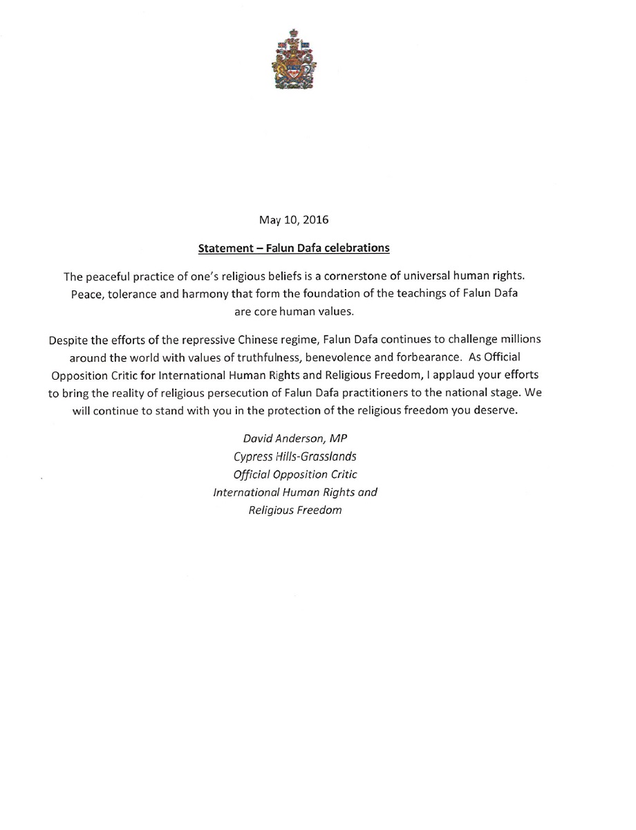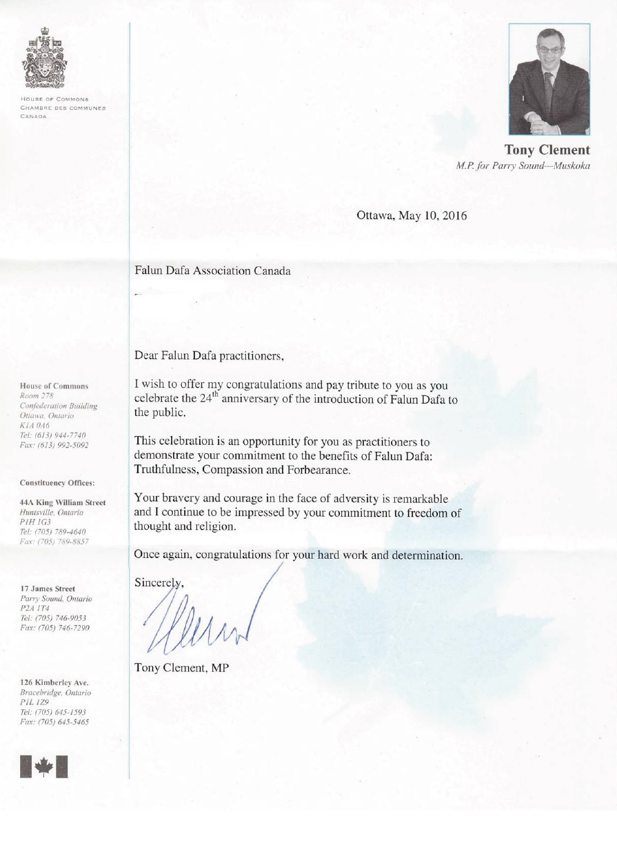 和平的信仰是普世人权的基石。以和平、忍让、和谐为基础的法轮大法的教导是关键的人类价值。 尽管有中共政权的迫害,但是法轮大法仍然将“真、善、忍”的价值观带给世界上的万千民众。 作为国际人权与宗教自由机构的官方反对党评论家,我赞扬你们向国家层面揭示出(中共)迫害法轮大法学员的真相。 我们将继续与你们站在一起,保护你们应有的信仰自由。 国会议员大卫•安德森 国会议员克莱门特(Tony Clement)的贺信  国会议员克莱门特(Tony Clement)的贺信 |