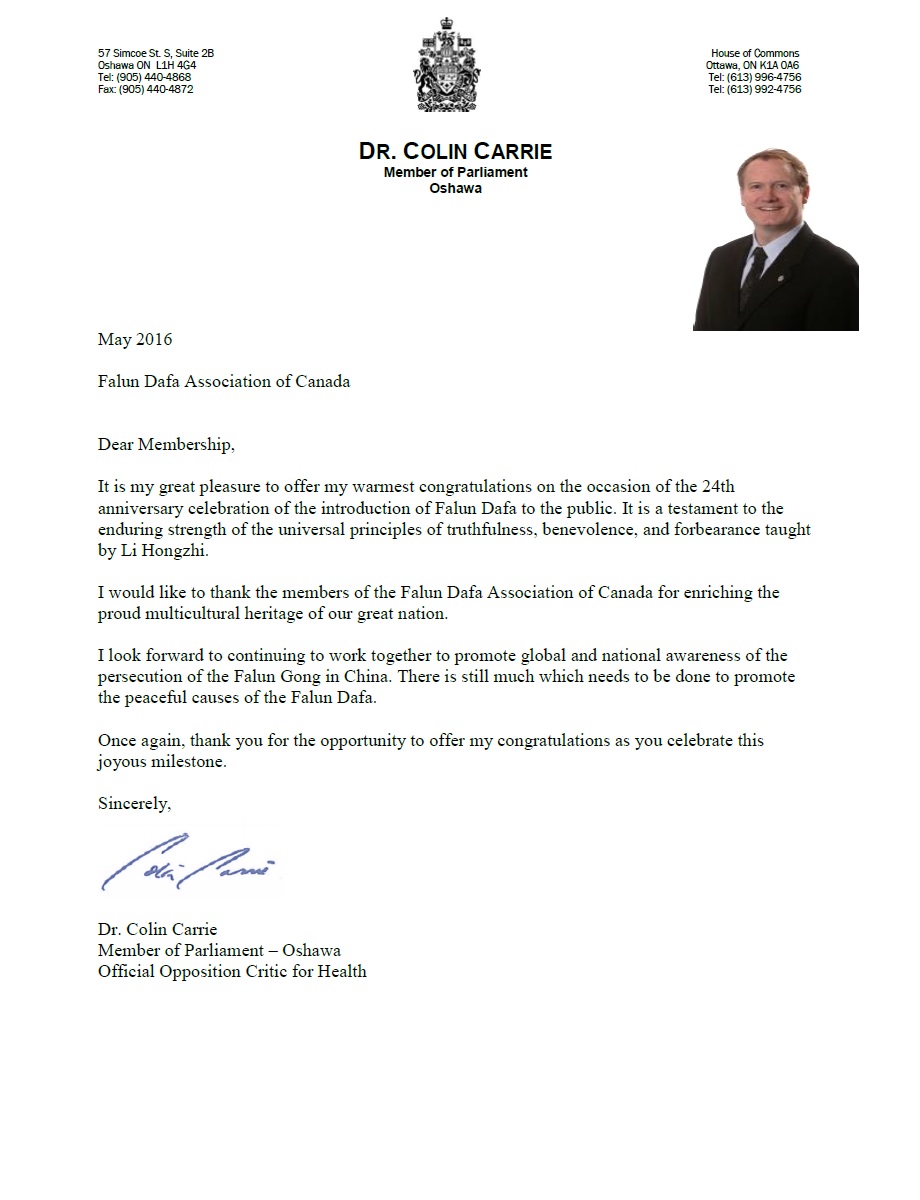 在你们庆祝法轮大法传世二十四周年之际,我要呈上我的祝贺与敬意。 作为法轮大法修炼者,这次的庆祝活动是你们展现坚信法轮大法原则“真、善、忍”及因此得益的机会。 你们在逆境面前展现的勇气与胆识是卓越的,我一直被你们坚守思想和宗教自由的行为所感动。 再次对你们的努力工作和决心表示祝贺。 国会议员克莱门特敬上 国会议员凯利(Colin Carrie)的贺信  国会议员凯利(Colin Carrie)的贺信 |