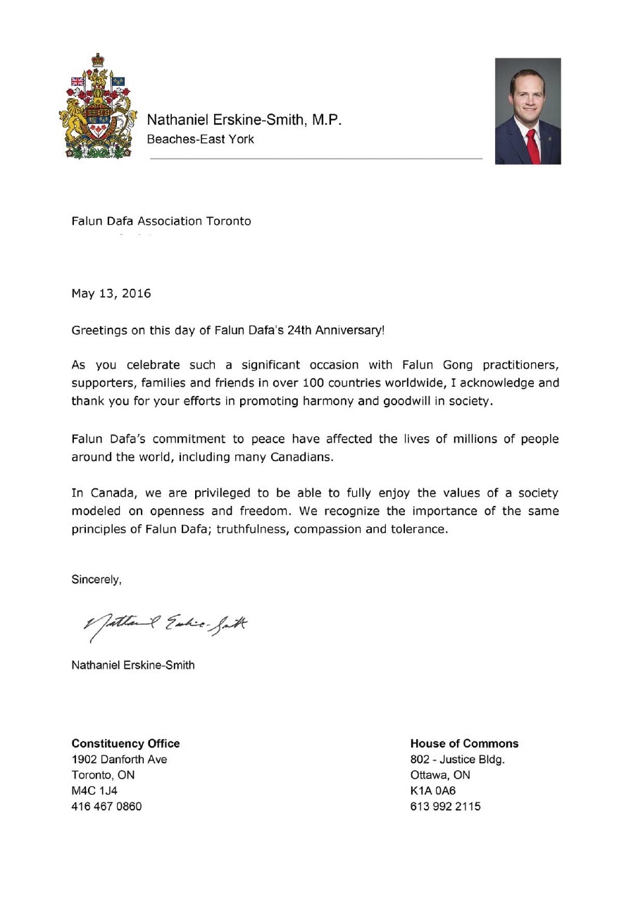 在庆祝法轮大法传世二十四周年之际,我很高兴能呈上我最热烈的祝贺。这证明了李洪志先生所教导的“真、善、忍”普世原则有持久的力量。 我要感谢加拿大法轮大法学会的成员,你们丰富了我们这伟大国家引以自豪的多元文化遗产。 我期待着继续和你们共同努力,在国内和国际上传播法轮功在中国被迫害的真相,因为倡导法轮大法的和平事业,还有很多需要做的工作。 在你们庆祝这个欢乐的里程碑之际,再次感谢你们给我这个呈上祝贺的机会。 国会议员凯利敬上 国会议员厄斯金•史密斯(Nathaniel Erskine-Smith)的贺信  国会议员厄斯金•史密斯(Nathaniel Erskine-Smith)的贺信 |