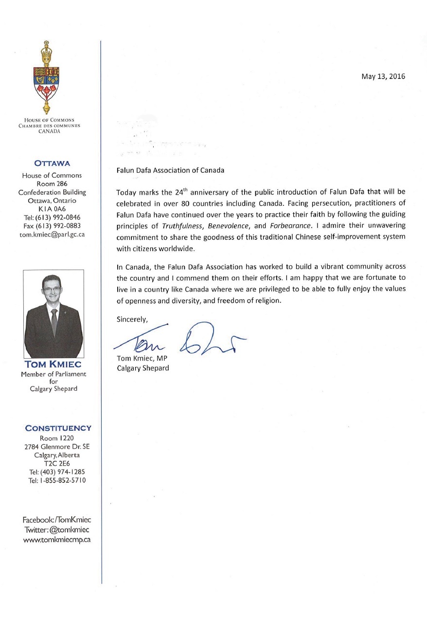 当法轮功修炼者、支持者、家人和朋友在全球超过一百个国家(和地区)举办如此重要的庆祝活动之际,我肯定并感谢你们在社会上倡导协和与善意的努力。 法轮大法对和平的坚守,影响了世上千百万人的人生,其中包括许多加拿大人。 在加拿大,我们很荣幸能够充分享受基于开放和自由的社会价值。我们知道法轮大法原则“真、善、忍”的重要性。 国会议员厄斯金•史密斯敬上 国会议员克米科(Tom Kmiec)的贺信  国会议员克米科(Tom Kmiec)的贺信 |