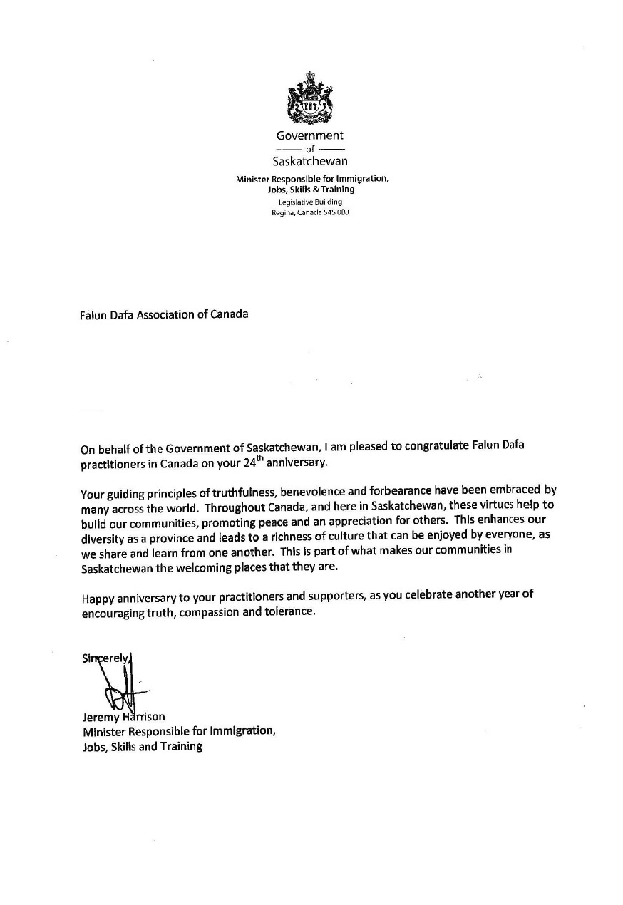 今天(五月十三日)是法轮大法传世二十四周年纪念日,全球超过八十个国家都会有庆祝活动。面对迫害,法轮大法修炼者一直坚守他们的信仰,坚守“真、善、忍”的原则。我佩服他们毫不动摇地与世人分享这一传统中国修炼功法的好处。 在加拿大,法轮大法学会已经在全国建立了一个充满活力的社区,我赞赏他们的努力。有幸生活在象加拿大这样的一个国家,我感到高兴,我们在这里能充分地享受开放、多元化及宗教自由的好处。 国会议员克米科敬上 国会议员韦伯(Len Webber)的贺信 在这个纪念法轮大法传世二十四周年的时刻,回顾和实践真、善、忍的原则。我为加拿大法轮大法学会传播这样的教诲,以及成为促进各社区协和、宽容、相互尊重和理解的典范,表示祝贺。 国会议员韦伯敬上 萨斯喀彻温省移民、就业、技能与培训厅长哈里森(Jeremy Harrison)的贺信  萨斯喀彻温省移民、就业、技能与培训厅长哈里森(Jeremy Harrison)的贺信 |