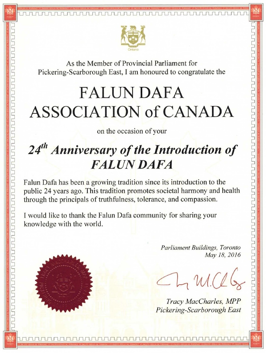 我很高兴代表萨斯喀彻温省政府,对庆祝法轮大法传世二十四周年的加拿大法轮大法修炼者呈上祝贺。 你们的指导原则真、善、忍已经被世界上众多的人信奉。在整个加拿大,尤其在萨斯喀彻温省,这些美德帮助塑造我们的社区、推动和平与相互欣赏,从而增强了我们省的多元化。因为我们可以分享和互相学习,使这里的文化更丰富,被更多人喜爱,这是使萨斯喀彻温省受欢迎的原因之一。 在你们庆祝鼓舞人心的真、善、忍迈入新的一年之际,我祝贺法轮大法修炼者和支持者周年庆典快乐。 厅长哈里森敬上 安省议员米查尔斯(Tracy McCharles)的贺信  安省议员米查尔斯(Tracy McCharles)的褒奖 |