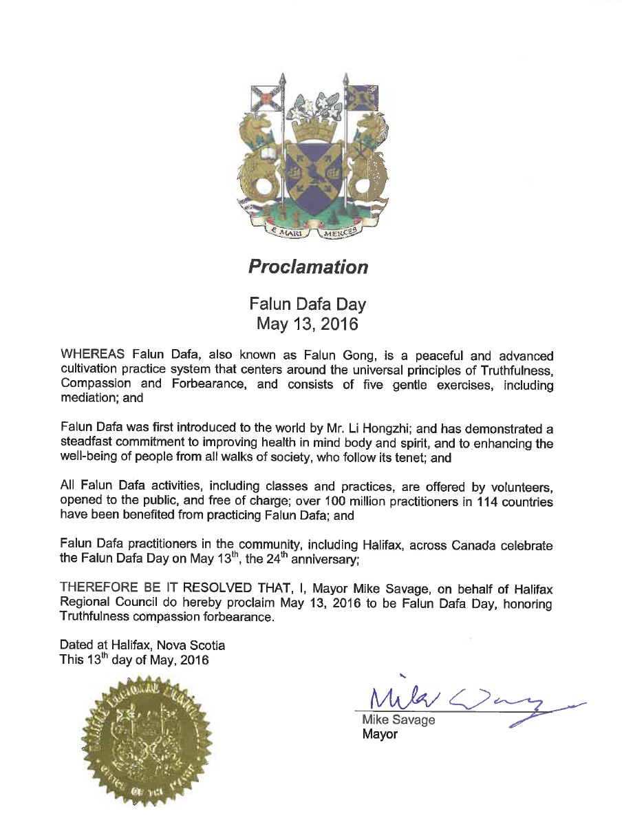 作为皮克林-士嘉堡东选区(Pickering–Scarborough East)的议员,我荣幸地在法轮大法传世二十四周年之际,向加拿大法轮大法学会表示祝贺。 自从二十四年前传世以来,法轮大法一直在成长,这功法通过“真、善、忍”原则促进社会协和与身体健康。 我要感谢法轮大法修炼者与世界分享你们的智慧。 安省议员米查尔斯敬上 新斯科舍省哈利法斯(Halifax)市长宣布法轮大法日  新斯科舍省哈利法斯(Halifax)市长的褒奖 |