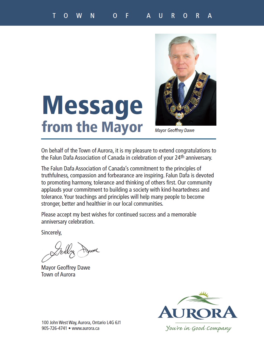 鉴于: 法轮大法,也称法轮功,是一种和平、高深的修炼方法,以普世价值“真、善、忍”为核心,有五套柔和的功法,包括打坐; 法轮大法由李洪志先生传出,坚定地致力于改善遵从其原则的人的身体、心理及精神健康,提升社会各阶层人士的生活质量; 所有法轮大法的活动,包括上课、炼功,都是由义工向公众提供的免费服务;全球已经有一百一十四个国家(和地区)里的超过一亿人因修炼法轮功得益; 在加拿大各地、包括哈利法斯的法轮大法修炼者,在五月十三日庆祝法轮大法传世二十四周年; 我,市长塞维治(Mike Savage),代表哈利法斯区域市议会宣布,二零一六年五月十三日为“法轮大法日”,以此对“真、善、忍”表示敬意。 市长塞维治签字 安省奥罗拉(Aurora)市长达维(Geoffrey Dawe)的贺信  安省奥罗拉(Aurora)市长达维(Geoffrey Dawe)的贺信 |