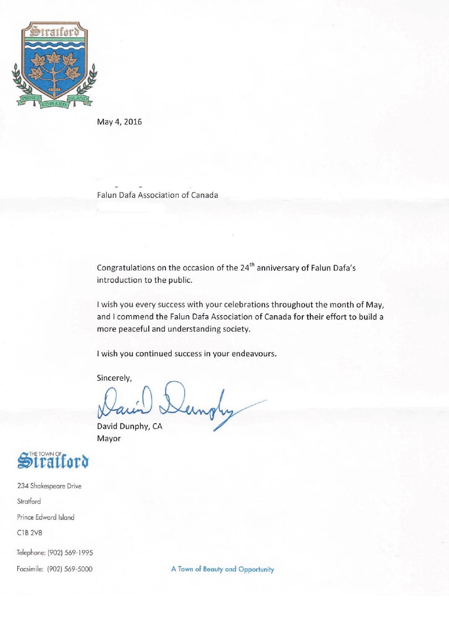 我很高兴代表奥罗拉,在庆祝法轮大法传世二十四周年之际,向加拿大法轮大法学会呈上祝贺。 你们坚守“真、善、忍”原则很鼓舞人心。法轮大法致力于促进协和、宽容及先考虑他人。我们的社区为你们致力于建设有善心和宽容的社会而喝彩。你们的教诲和原则,将在我们当地社区帮助很多人变得更坚强、更好、更健康。 请接受我最美好的祝愿,祝你们持续成功,周年庆典令人难忘。 市长达维敬上 爱德华王子岛斯特拉特福(Stratford)市长邓费(David Dunphy)的贺信  爱德华王子岛斯特拉特福(Stratford)市长邓费(David Dunphy)的贺信 |