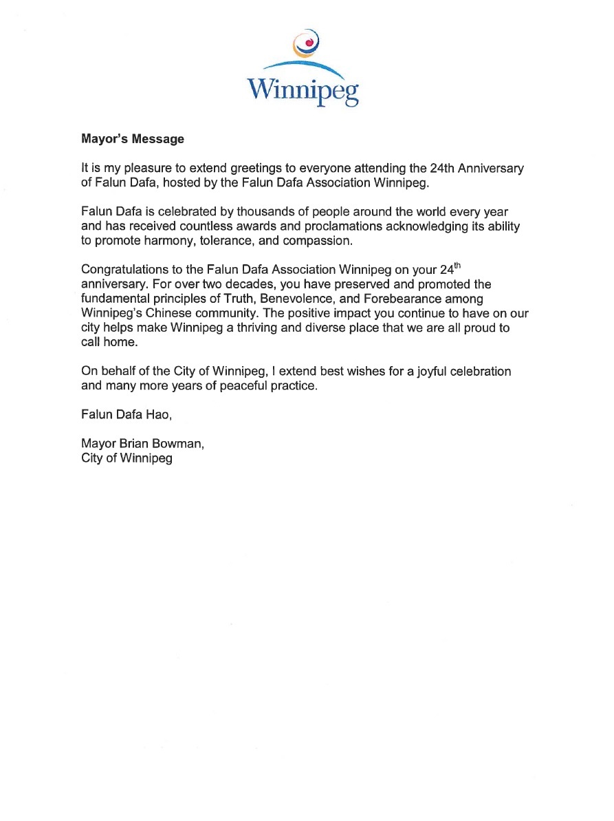 祝贺法轮大法传世二十四周年: 我祝愿你们在五月份的庆祝活动获得圆满成功,我表彰加拿大法轮大法学会对建设一个更和平、更理解的社会所做出的努力。 我祝愿你们的努力继续获得成功。 市长邓费敬上 温尼伯市长Brian Bowman的贺信  温尼伯市长Brian Bowman的贺信 |