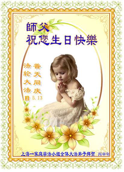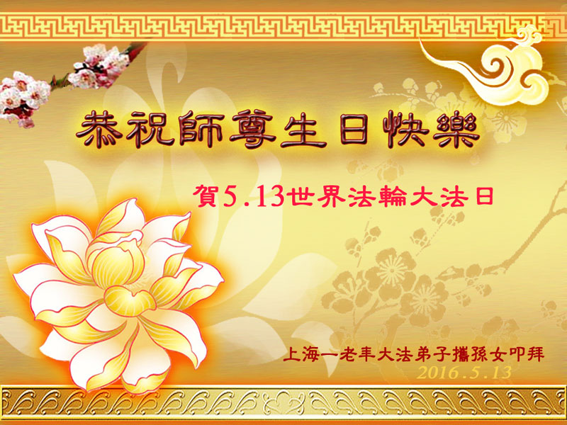 在5.13神圣而伟大的世界法轮大法日,在全世界同庆同颂的殊胜日,向最最伟大最最慈悲的师父跪拜!恭祝师父生日快乐!我们深深感恩师父!师父您辛苦了!感恩师父将宇宙大法的福音“真、善、忍”的真理传遍世界,福祉人类。感恩师父教会我们如何做一个道德高尚的人。大法的美好与神圣使亿万群众达到身体健康,道德升华,人心归正,我们的生命得于重塑,使我们的生命才有了希望。为今生今世能成为大法的修炼者感到无比荣幸。师父啊,您为救度众生承受了无法想象的巨难,为众生操尽了心。在今后不多的日子里唯有用我的一颗纯净的心,牢记师父的谆谆教诲,勇猛精進,修好自己,跟上正法進程,努力使自己成为合格的大法弟子,才能不辜负师父的慈悲救度。谢谢师父! 上海大法弟子敬贺师尊华诞!恭贺法轮大法日!