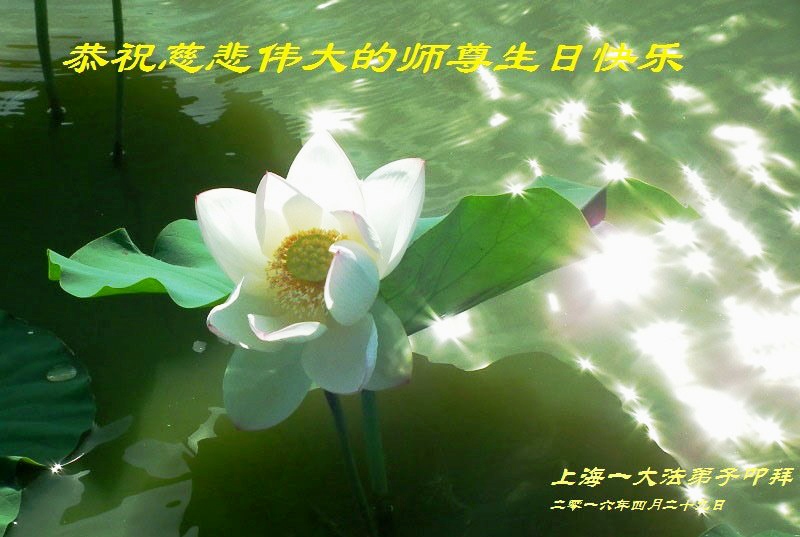 感恩师尊救度之恩!弟子无法用语言表达,弟子一定听师父的话,多学法,把大法的真相、生命得救的真相告诉有缘的人。跟师父回家!双手合十跪拜恩师! 上海市大法弟子恭祝慈悲伟大的师尊生日快乐!恭贺5·13世界法轮大法日和法轮大法洪传24周年!