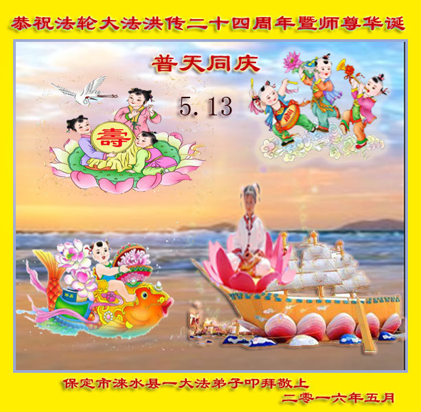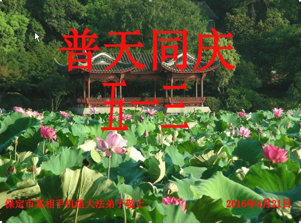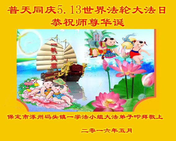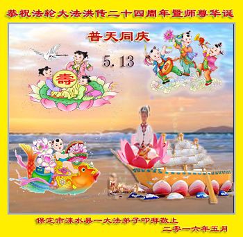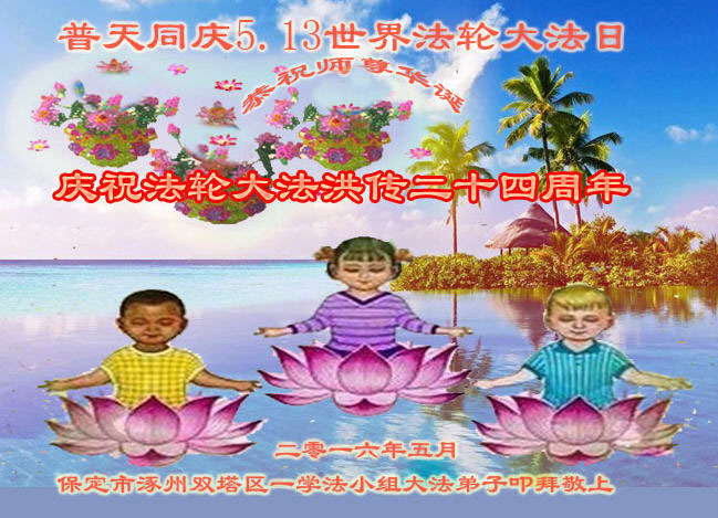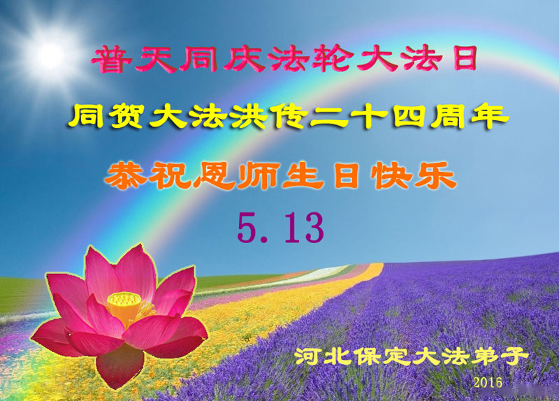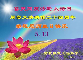 【明慧网二零一六年五月八日】 河北保定大法弟子祝师尊生日快乐!普天同庆世界法轮大法日!