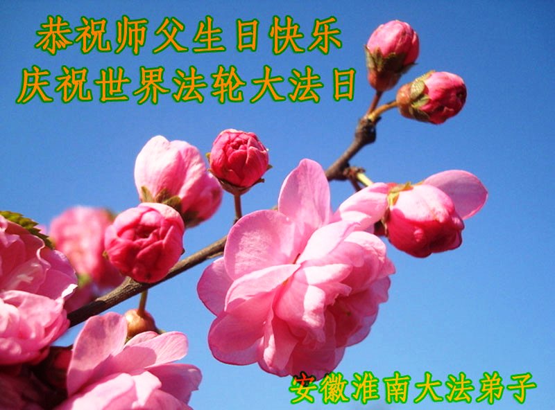 师尊您辛苦了!在这个普天同庆的日子里,弟子告诉自己:时刻想到自己是大法弟子,一思一念不忘救度众生;一思一念不忘灭尽邪恶;同化真、善、忍在不同层次的要求标准。抓紧时间学法,抓紧时间实修,圆满随师尊回家。 安徽省合肥一大法弟子恭祝师尊华诞快乐并恭贺世界法轮大法日!