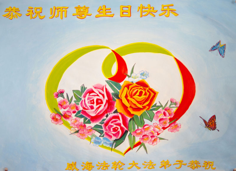 这幅画是一对老年姐妹共同创意的。 小孙女问:“奶奶,盒子里装的是什么?” “给师父的礼物。” “什么礼物?” “一颗修炼的心,一颗向善的心。” “嗯……” 采来百花敬师尊 感念师父救度恩 姐妹修炼同精進 紧随师尊返天门 威海姐妹大法弟子 山东省烟台市莱山区全体大法弟子祝慈悲伟大的师父生日快乐!
