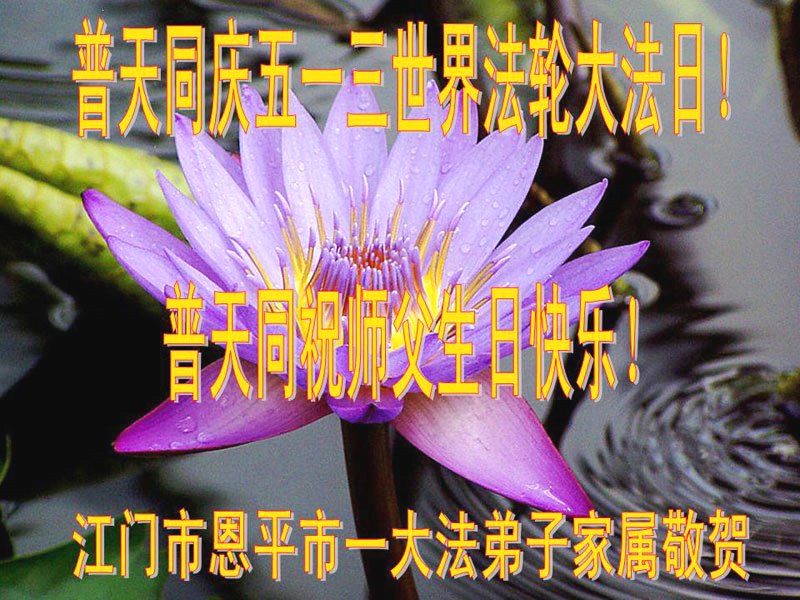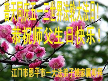 广东省江门市恩平市一大法弟子携家属普天同祝师父生日快乐!普天同庆世界法轮大法日!