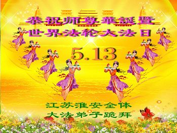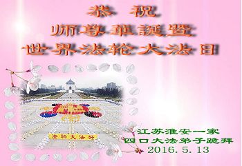 【明慧网二零一六年五月八日】 江苏省淮安市全体大法弟子恭祝慈悲伟大的师尊生日快乐!普天同庆世界法轮大法日!