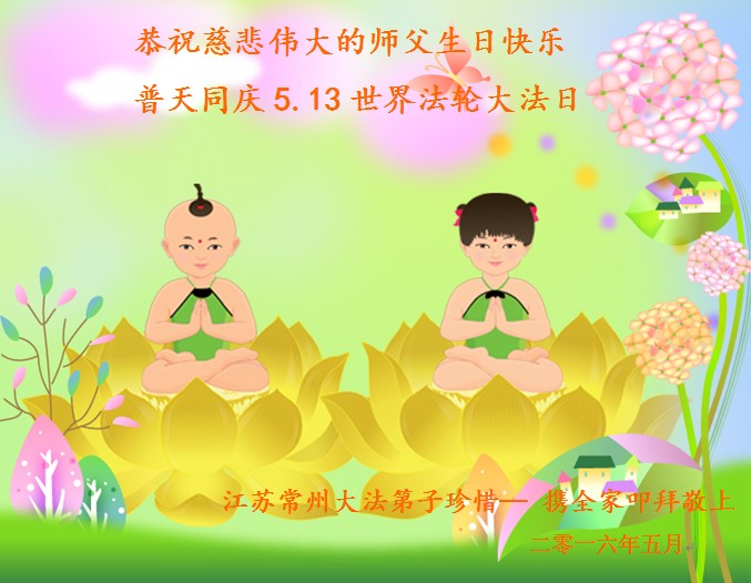 师尊佛恩浩荡,为众生操尽了心,师父辛苦了!感谢师父对我们全家的慈悲救度、看护!千言万语也表达不了我们对您的祝福和思念!我们一定听师尊的话,修好自己,做好三件事,快救人、多救人,实现史前大愿,跟师父回家。叩拜师尊! 江苏常州大法弟子恭祝伟大师尊生日快乐!普天同庆5.13世界法轮大法日!