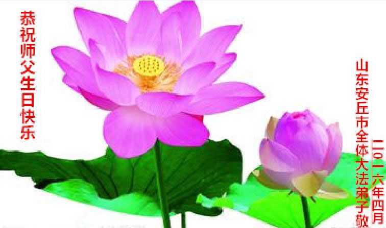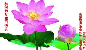 【明慧网二零一六年五月八日】 山东省潍坊市安丘市全体大法弟子恭祝师父生日快乐!