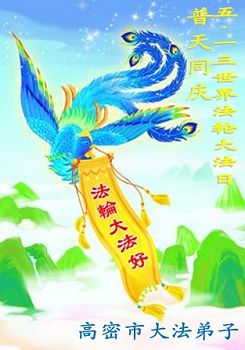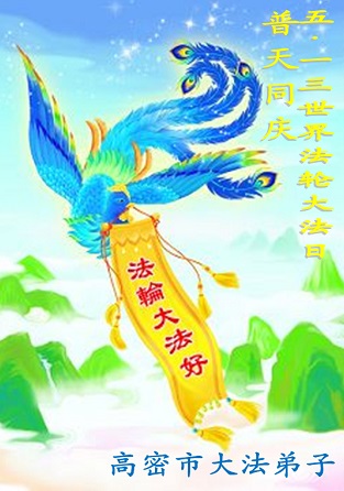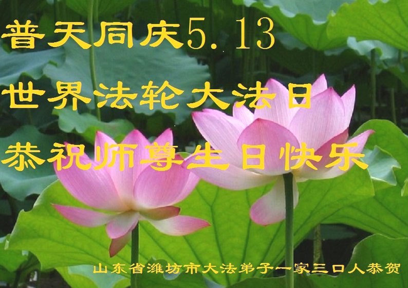山东省潍坊高密市大法弟子一家三口,及姐姐,妹妹同修和学法小组的同修恭祝慈悲伟大的师尊生日快乐!恭祝5.13法轮大法日暨大法洪传二十四周年!